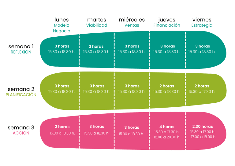 Sabemos que cada emprendedor tiene un ritmo diferente, por eso en esta fase no hay horarios preestablecidos. La dedicación diaria recomendada es de 2 horas como mínimo, aunque puedes invertir más tiempo si lo deseas y avanzar más rápido. Cuanto más avances en esta fase, más rendimiento obtendrás de la segunda fase.