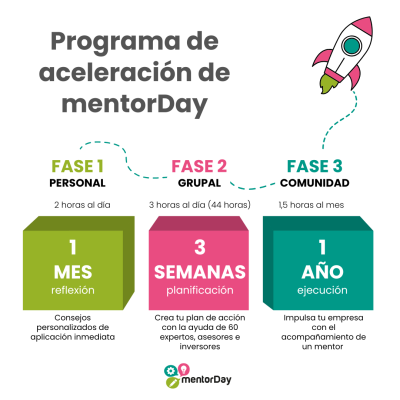 - Acreditación oficial: solo los 30 primeros emprendedores del ranking al final de la Fase 2 recibirán la certificación oficial “Empresa Acelerada por mentorDay” y podrán acceder a todos los beneficios exclusivos de la comunidad mentorDay.