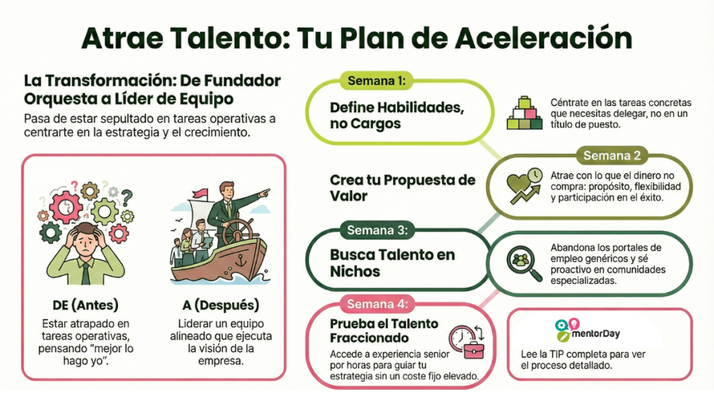 - Semana 4: Prueba el Talento Fraccionado. Si necesitas un perfil senior (CFO, CTO) pero no puedes pagarlo, contrata a un ejecutivo fraccionado (por horas o proyectos). Te dará la estrategia sin el coste fijo completo.