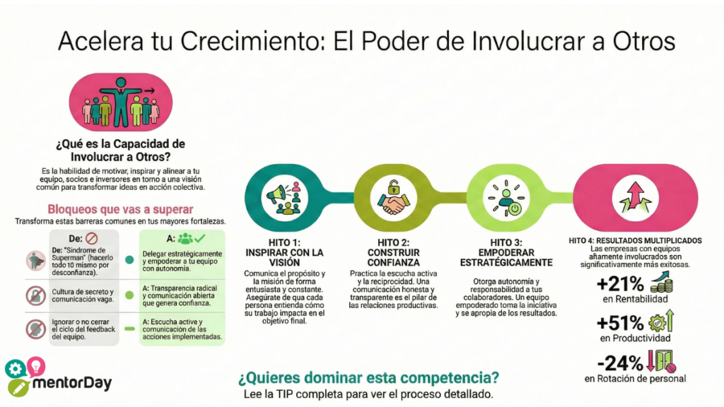 Esta capacidad es crucial porque convierte el esfuerzo individual en una fuerza multiplicadora. Los emprendimientos rara vez prosperan en soledad; dominar el arte de involucrar a otros es una necesidad estratégica. Mejorarla acelera la empresa porque garantiza que cualquier iniciativa estratégica o plan de cambio tenga una alta probabilidad de éxito . Cuando los colaboradores se sienten involucrados en la toma de decisiones, se «suben al resultado» y están más dispuestos a ejecutar y asumir responsabilidades, permitiendo al emprendedor dejar de ser meramente operativo para volverse estratégico