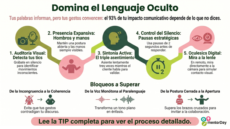 Comunicación no verbal en pitch de negocio con postura abierta contacto visual manos visibles expresión segura y liderazgo ante clientes e inversores.