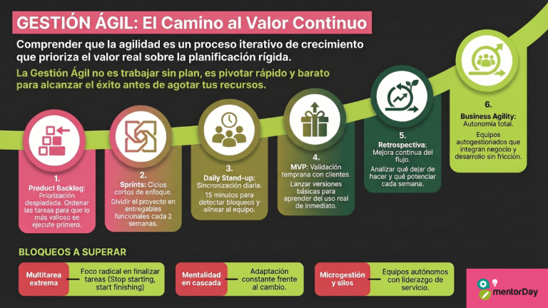 Gestión ágil de proyectos con tablero kanban sprint reuniones diarias métricas de flujo y equipo colaborando en startup moderna