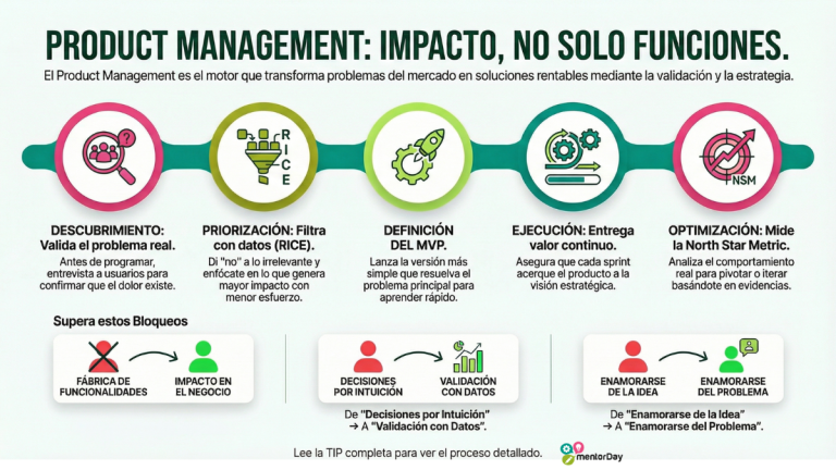 Product management en startup con roadmap métricas discovery entrevistas de usuario priorización y coordinación entre negocio diseño y tecnología