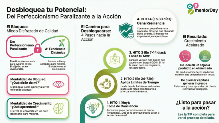¿Tu producto nunca está listo? El perfeccionismo paralizante disfraza el miedo al fracaso. Aprende a aplicar la Ley de Parkinson, lanzar tu MVP y desbloquear tu empresa con esta guía práctica de mentorDay
