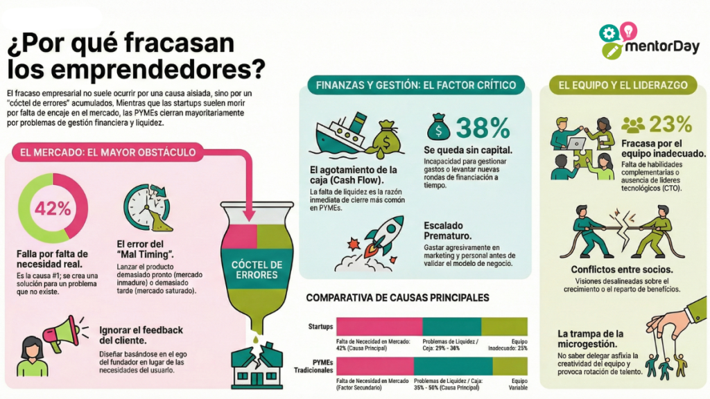 - Equipo promotor inadecuado: Falta de habilidades complementarias o ausencia de perfiles clave (ej. CTO en tech) (23%).