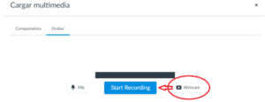 - Grabarlo directamente en el foro. Para ello, tendrás que pinchar en el mismo botón de la imagen pero seleccionar “grabar” en vez de “computadora”. Ahí, solo tendrás que darle a “WebCam” y a“Start Recording”.