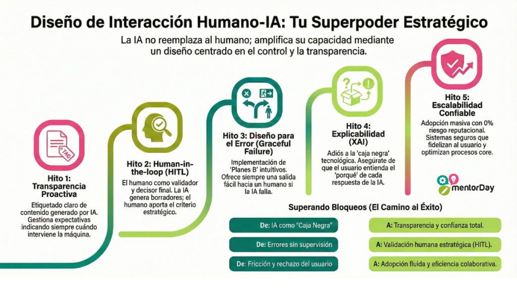 • Diseño para el error (Graceful Failure): Implementa siempre un «Plan B» intuitivo (ej. botón de deshacer, hablar con un humano) para cuando la IA se equivoca o alucina.
