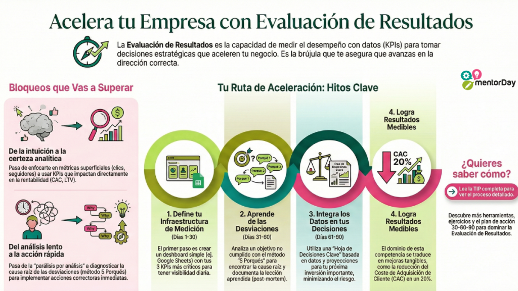 La Evaluación de Resultados (ER) es la capacidad de medir el desempeño de acciones empresariales mediante KPIs y análisis de datos, para juzgar si se han logrado los objetivos y tomar decisiones informadas. Es comparar resultados reales con los deseados y validar la efectividad de la estrategia, basando la gestión en datos, no en intuición. Es la brújula que garantiza que el proyecto avance en la dirección correcta. Permite definir objetivos SMART, medición y análisis, acción correctiva y aprendizaje continuo. Así aumenta la rentabilidad, disminuye el riesgo y mejora la confianza y la capacidad de adaptación.