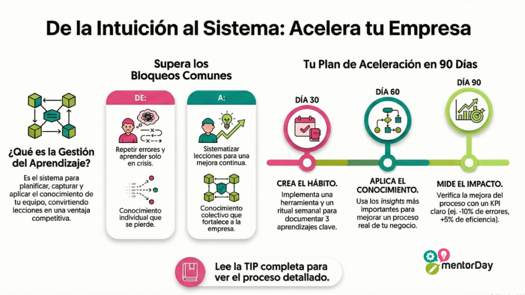 | 60 días | Aplicar los 5 aprendizajes más relevantes a un proceso. | 70% de insights aplicados. | SOP actualizado. |