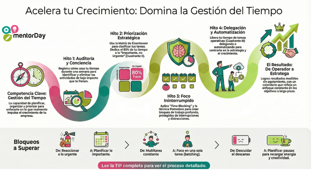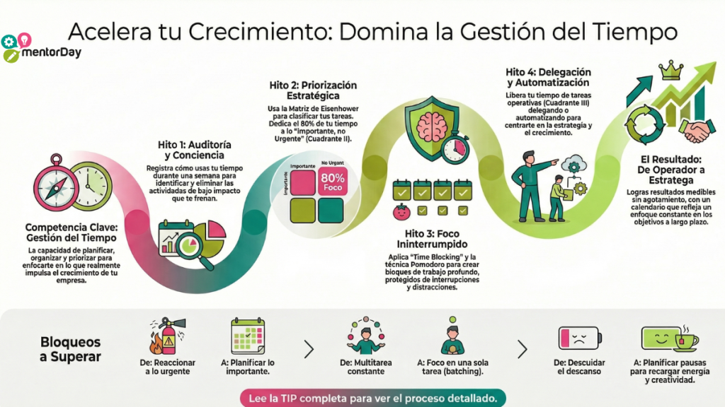 Mejorar la Gestión del Tiempo acelera tu empresa porque te obliga a proteger las actividades de alto impacto (trabajo estratégico, planificación, revisión de métricas) del torbellino diario de urgencias. Esto permite al fundador pasar de un perfil puramente técnico u operativo a uno directivo y emprendedor, asegurando que las acciones diarias se alineen con los objetivos crucialmente importantes y medibles a largo plazo.