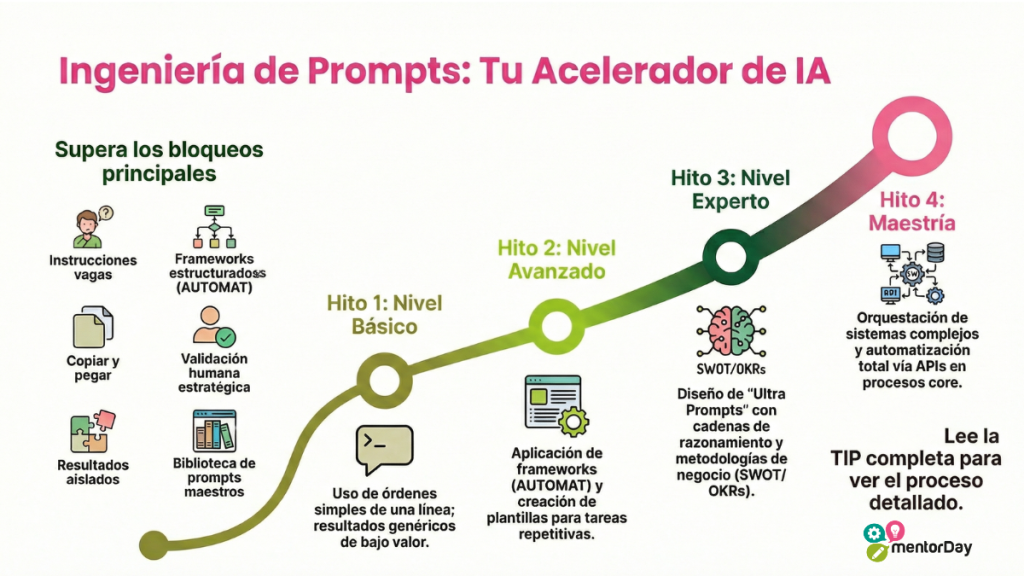 • Días 1-30: Mapear las 3 tareas más repetitivas de tu área. Estudiar los componentes de un framework estructurado y redactar los primeros 3 prompts.