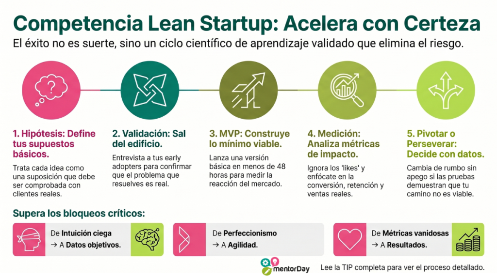 Dominar Lean Startup sustituye la intuición ciega por datos objetivos. Esto acelera el negocio porque cortas de raíz los meses de desarrollo en aislamiento, logrando tus primeros ingresos e hitos de tracción mucho más rápido al enfocarte en lo que el cliente realmente está dispuesto a pagar.