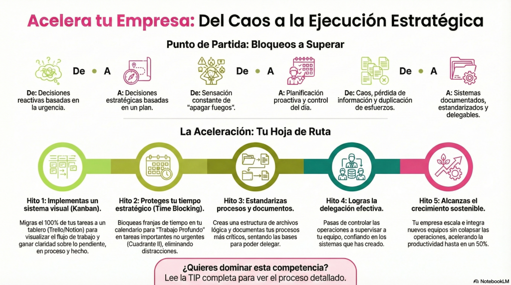 | 90 Días | Documentar los 3 procesos internos más críticos para facilitar la delegación (ej. Onboarding, Gestión de pedidos, Facturación). | % de procesos críticos con documentación estandarizada. | Wiki interna (o archivo Notion) con los procedimientos operativos. |