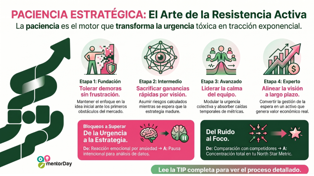 Porque el éxito sostenido no ocurre de la noche a la mañana y los modelos de negocio reales tardan en validarse. Si lideras desde la urgencia constante, tomarás decisiones impulsivas, agotarás tu capital rápidamente y quemarás a tu equipo con microgestión. La paciencia elimina los errores por precipitación, dándole a tu producto el tiempo necesario para encajar perfectamente en el mercado.