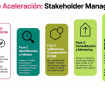 Stakeholder management en startup con mapa de poder e interés reuniones estratégicas comunicación con inversores clientes equipo y reguladores en entorno profesional moderno.