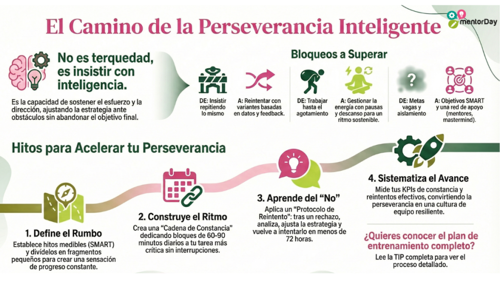 Perseverar no significa repetir indefinidamente las mismas fórmulas, sino mantener la convicción en la meta mientras se ajustan los métodos para alcanzarla. Es la diferencia entre un emprendedor que abandona antes de tiempo y el que finalmente lo consigue. Implica no solo acción constante, sino también la capacidad de aprender de los errores y ajustar el rumbo cuando es necesario.